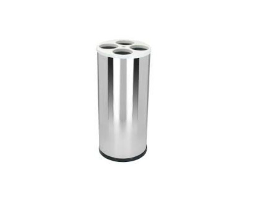 Confeccionado em aço inoxidável AISI 430, com fundo em plástico ABS e tampa injetada em plástico polipropileno (PP), tubos internos extrusado em poliestireno (PSAI) sendo 4 (quatro) tubos para copos de água e 1 (um) para descarte de palhetas usadas.
